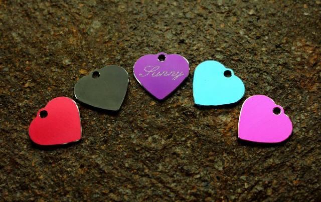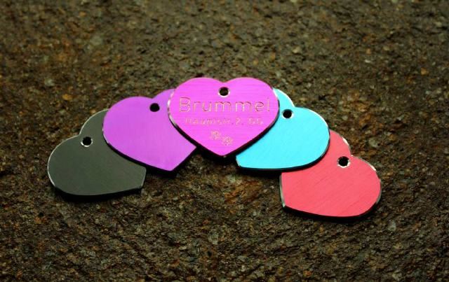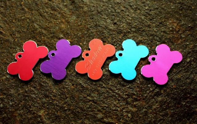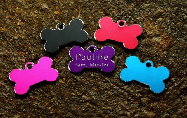 ❤️ Zarte Hundemarken mit hochwertiger farbiger Eloxierung, deren Kante auf der Vorderseite schräg angeschliffen und dadurch silbrig glänzend ist.